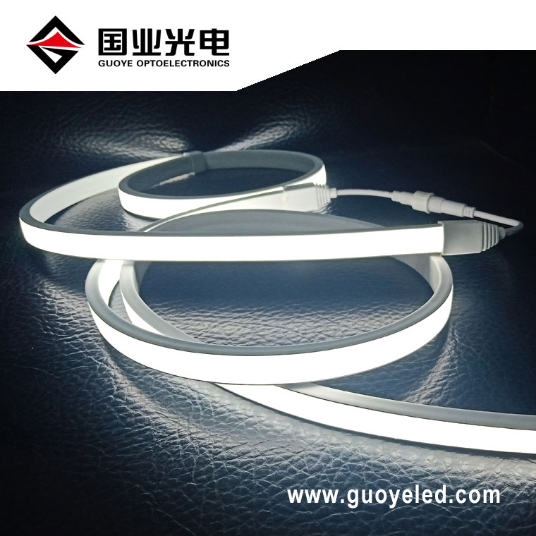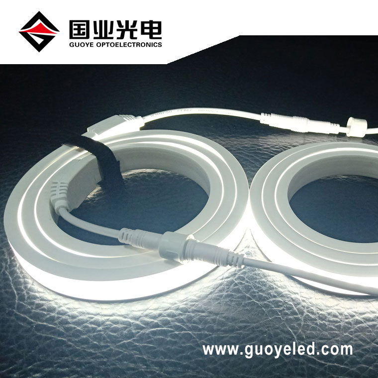 Guoye Optoelectronics factory offer flexible neon led strip 220v light. Buy batch quantity with discount price. Newly arrived product, anti-Dazzle high voltage led strip, PVC appearance milky white mask, adopts 2835 SMD, 144 leds per meter, light body size is 15 x 7mm, 2-year warranty. Can be customized color warm white 3000K, natural white 4000K, positive white 6000K, etc., 50 meters/roll/box packaging, with power lines and other connectors. Welcome to learn more about product specifications.